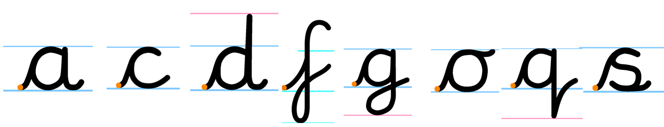 Clear evidence of cursive formation for the letters a, c, d, g, o, s and q is expected.