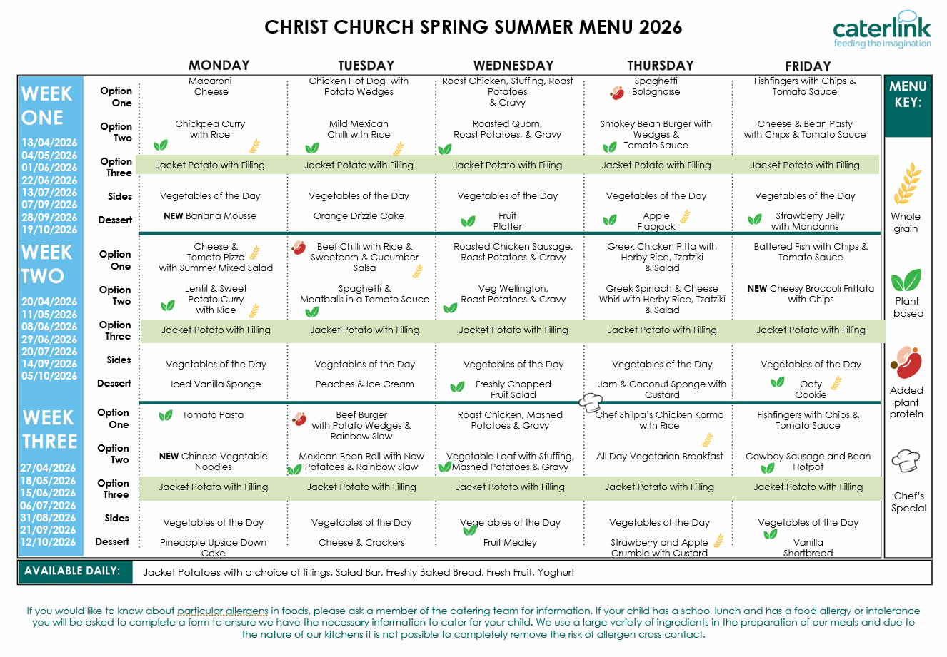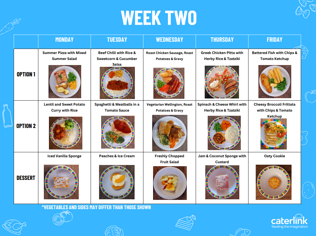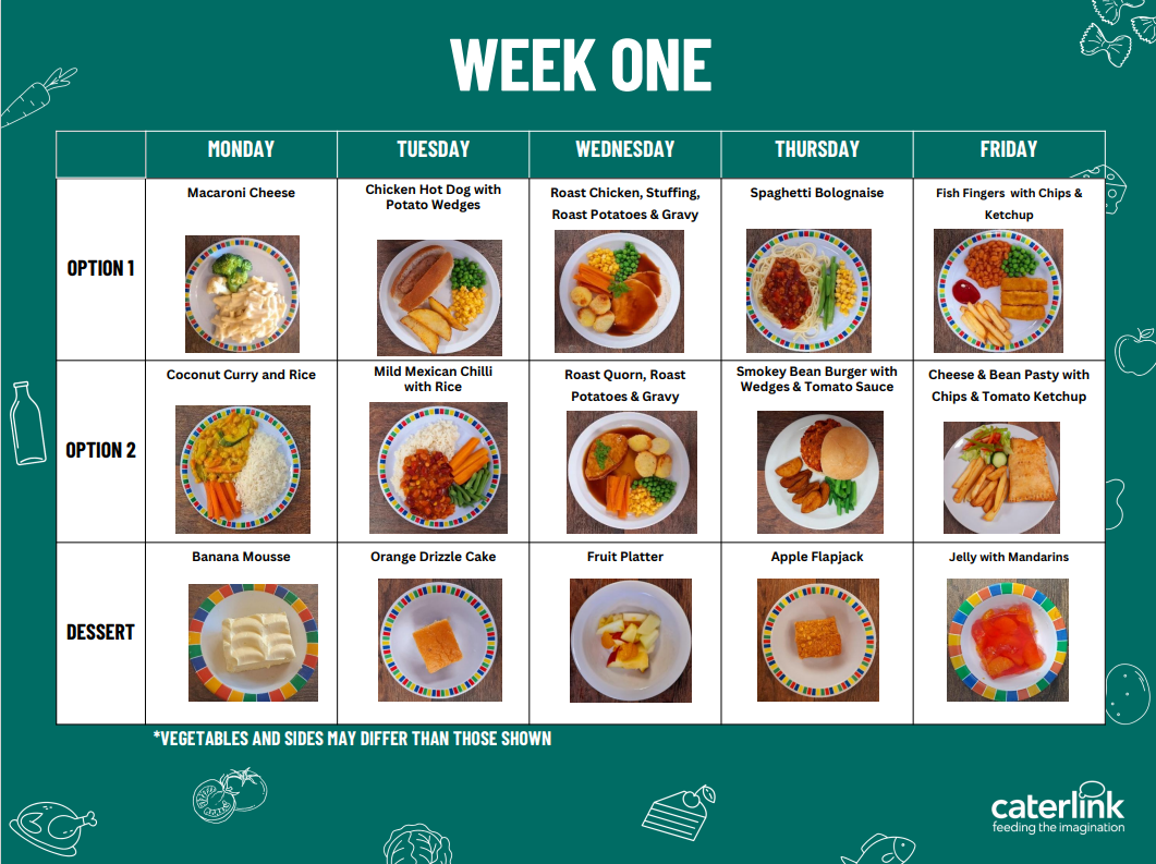 The menu changes termly and is posted on the notice board as well as in this area of the website.